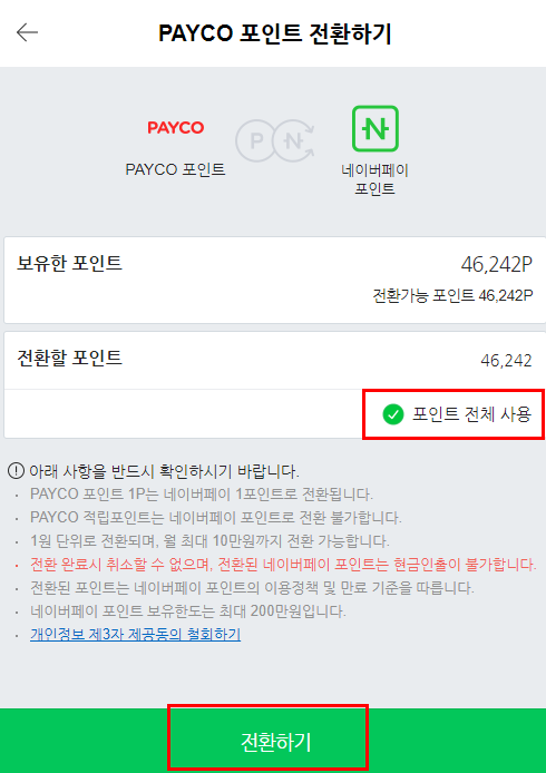 포인트 전체 사용을 체크하고 [전환하기]를 눌러줍니다.
