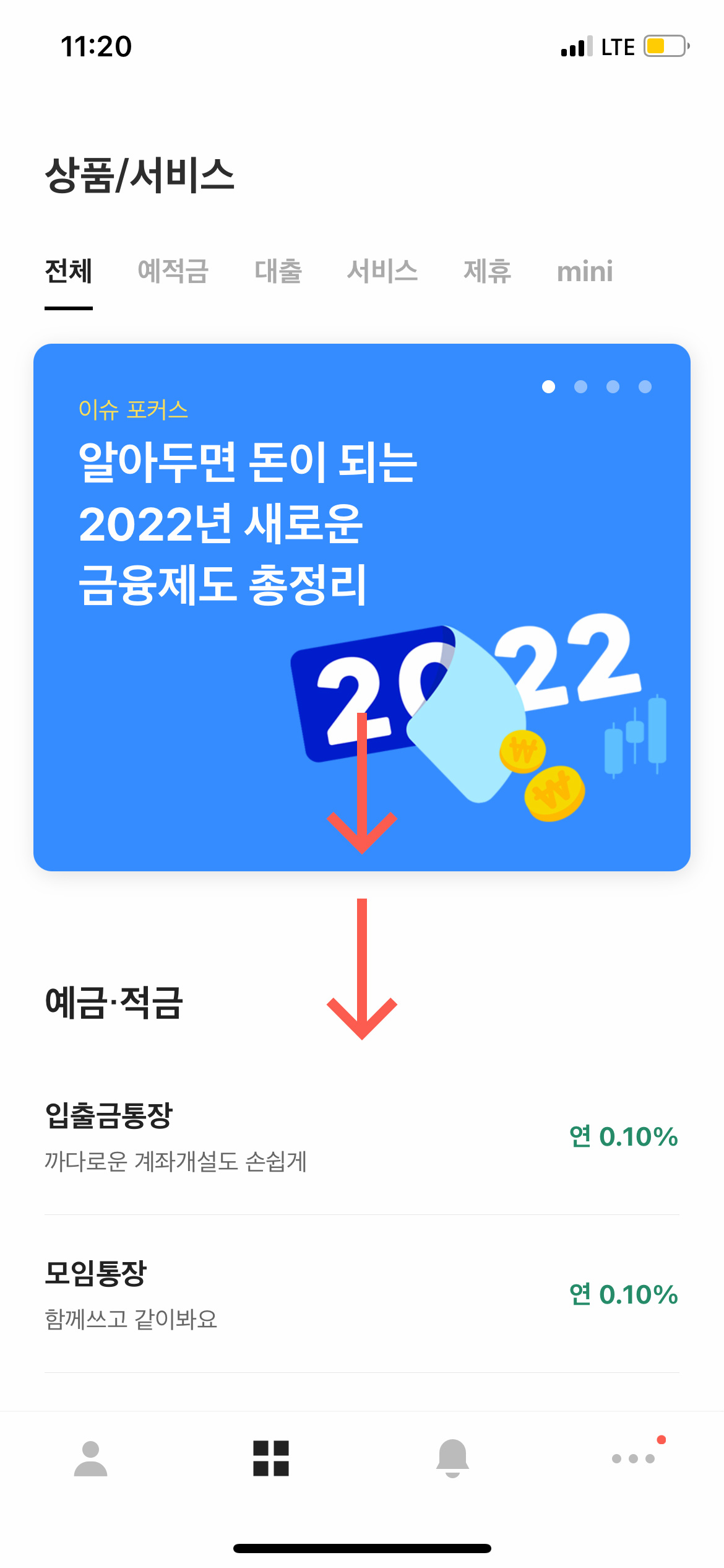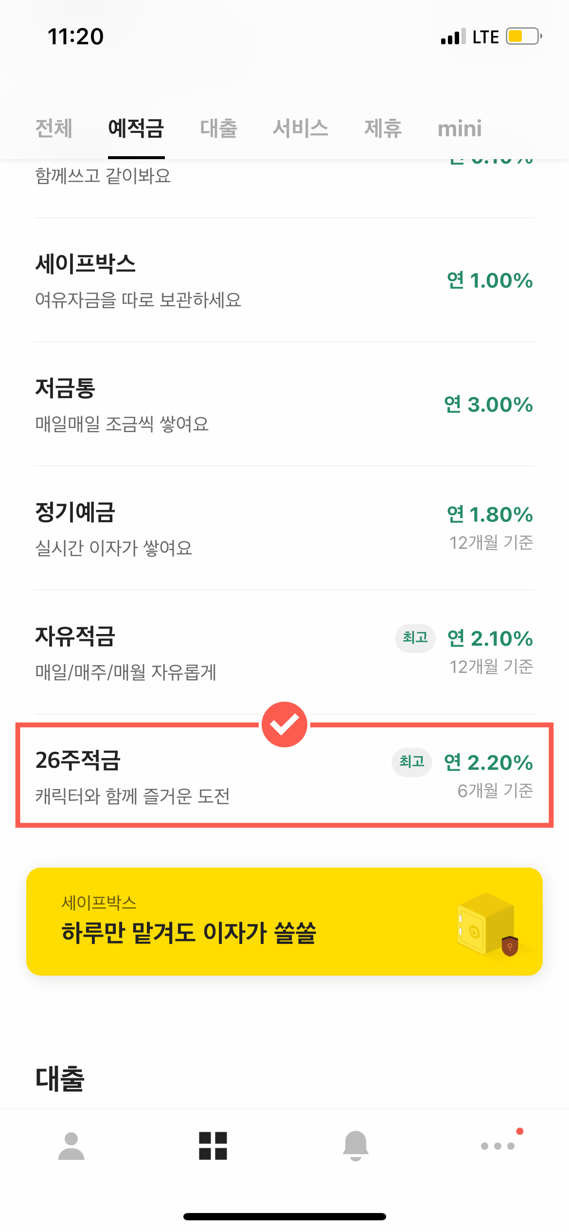 4. 상품/서비스 페이지에서 하단으로 스크롤한다. -> [26주 적금]을 선택한다.