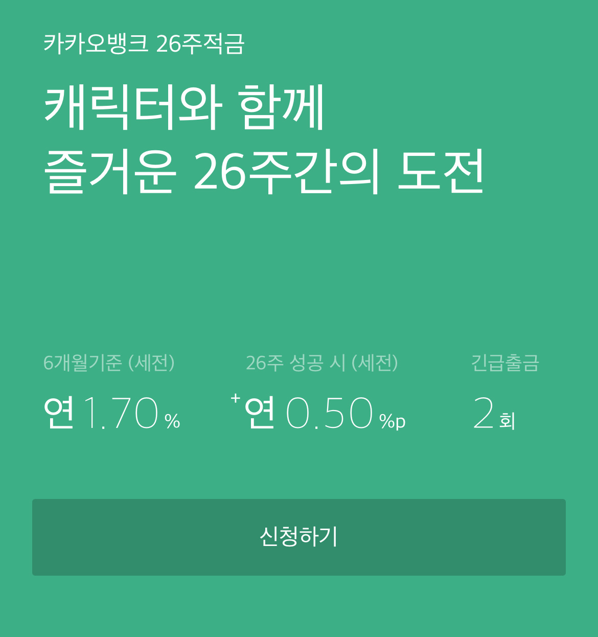 | 기본 금리 + 우대 금리 | 6개월 1.7% + 7주 연속 성공시 : +0.2% + 26주 연속 성공시 : +0.3% |