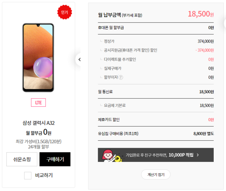 24개월 요금 할인: 매월 통신료 35%할인됩니다. 하지만 요금할인으로 A32를 구매할 경우, 기기값 374,000원을 매월 납부해야합니다.