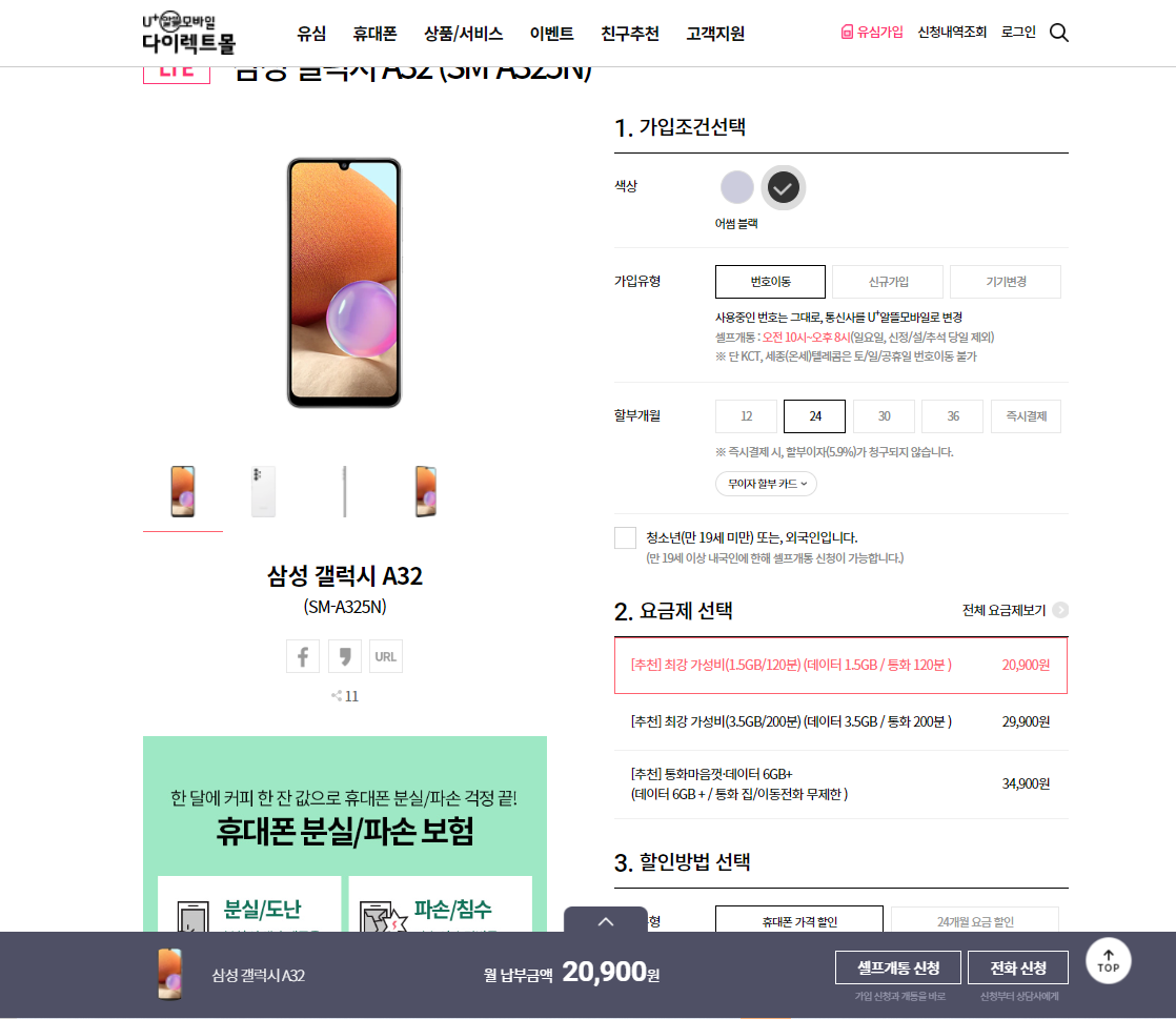 1. u+ 알뜰 모바일 다이렉트몰 접속 ▶ 휴대폰 ▶ A32 선택