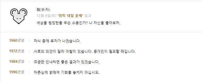 [오늘의 운세] 2022년 12월 6일(음력 11월 13일) 화요일 띠별 운세▶쥐띠의 2022년 12월 6일 오늘의 운세36년 추진하는 일은 때가 오니 잘 해결 되니 기쁘고 즐겁다.48년 미래를 판단하고 정확히 예측하